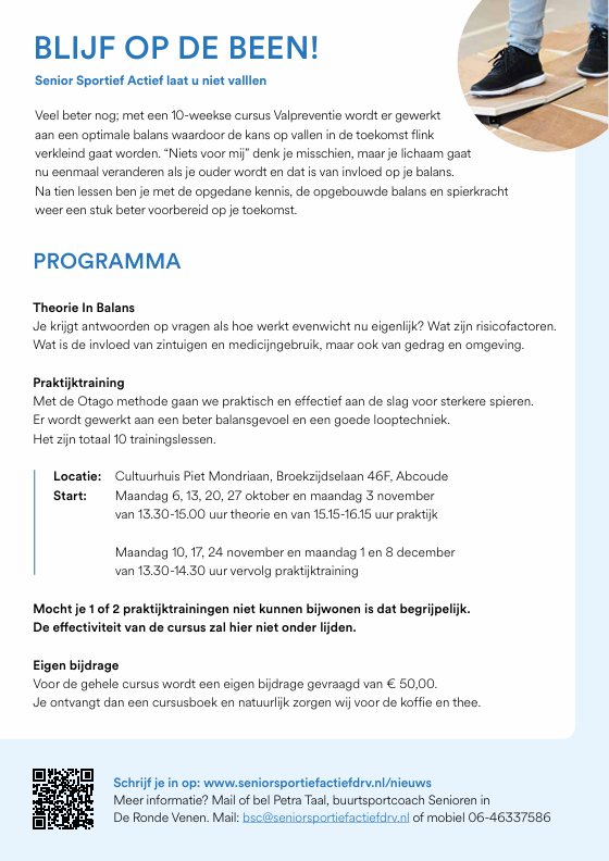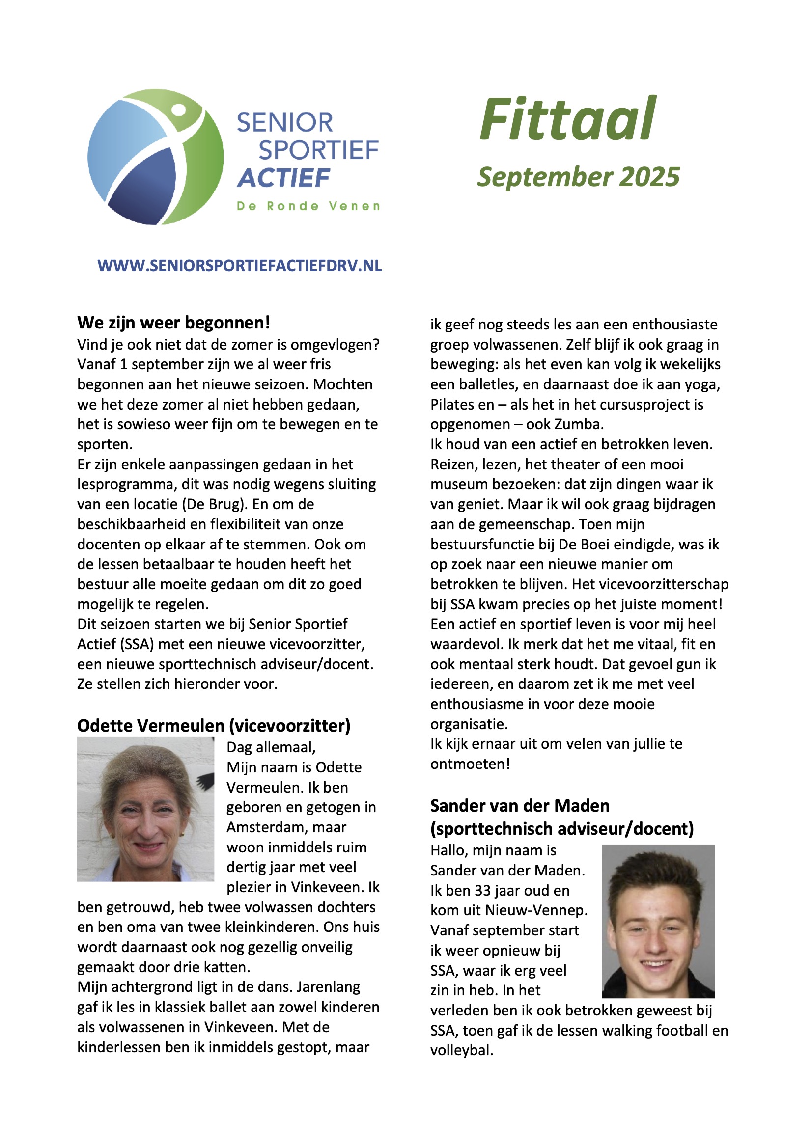 Alles draait om beweging bij Senior Sportief Actief De Ronde Venen. En dat is niet alleen ons advies aan senioren, wij zorgen er ook echt voor. Vandaar dat wij zeggen: zorg voor beweging. Dat doen wij middels ruim 50 wekelijkse lessen gegeven door 19 gediplomeerde docenten en ondersteund door ruim 70 vrijwilligers. Bovendien, onze lessen houden je niet alleen fit en gezond. De lessen bieden ook gezelligheid en verbondenheid.
