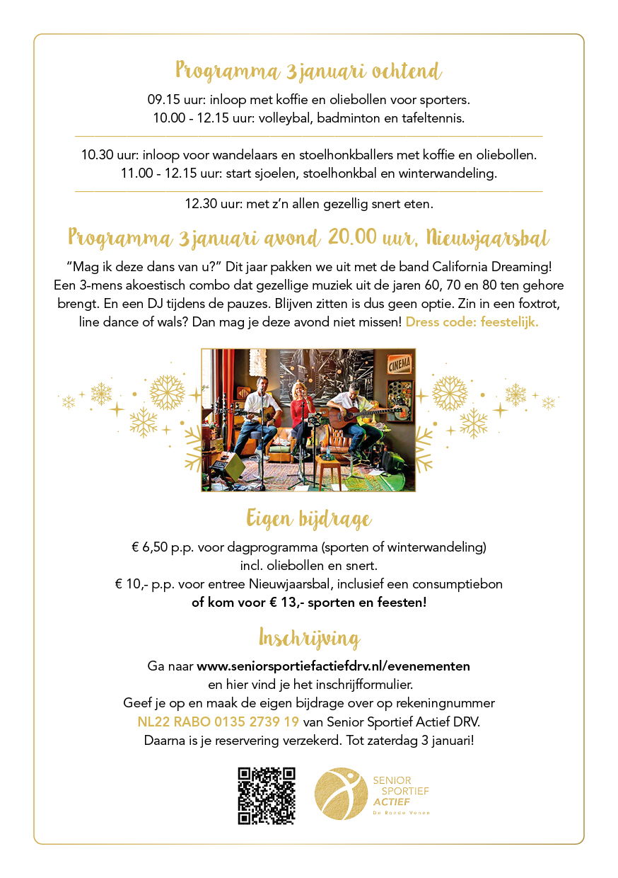 Klik hier voor het verslag van sportieve en gezellige van afgelopen 4 januari. Klik hier voor het aanmelden Sportief Nieuwjaar 2026 op 3 januari. Alleen nog mogelijk voor de feestavond!