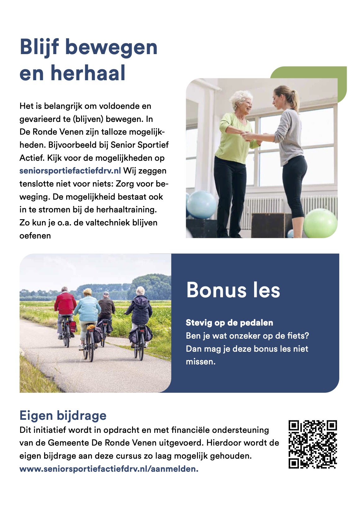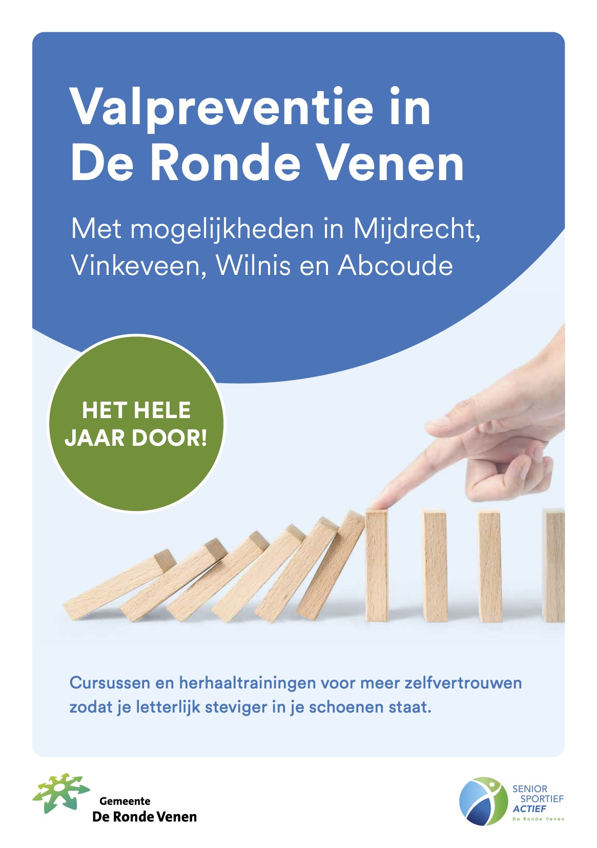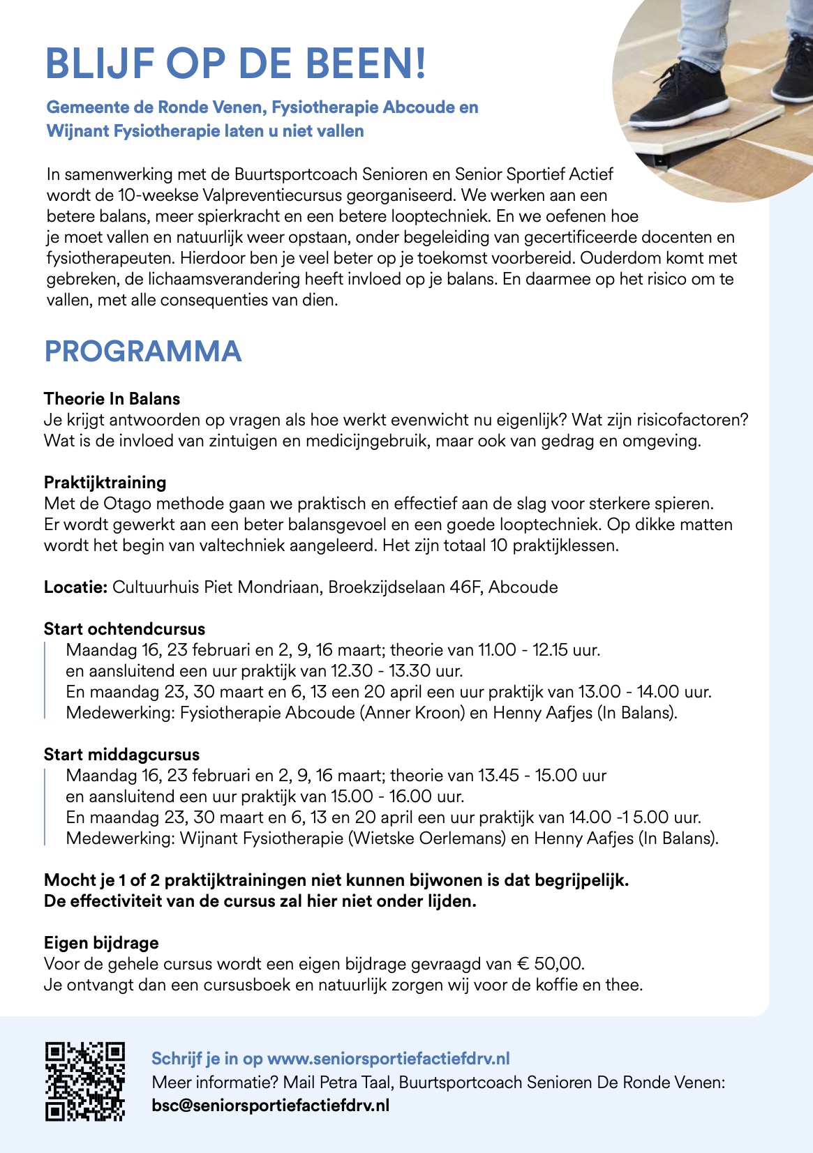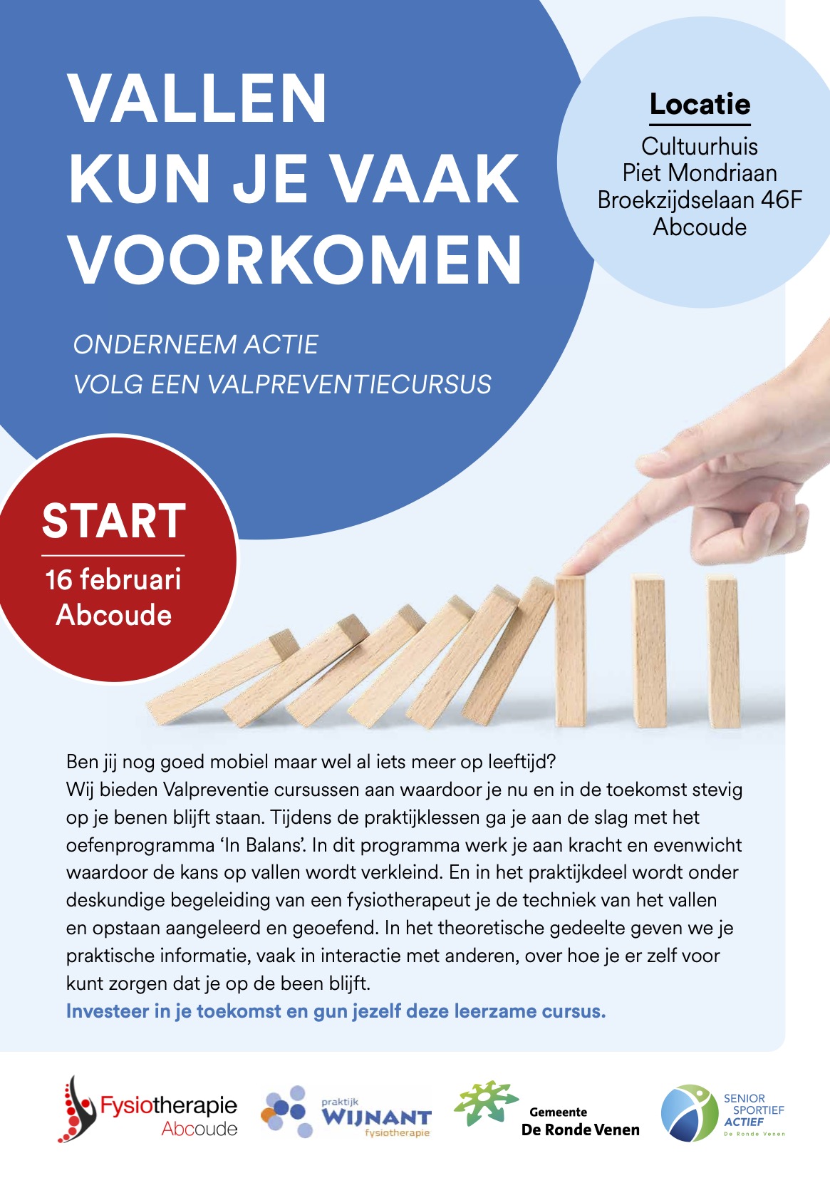De cursus duurt 10 weken en wordt gegeven in opdracht van de Gemeente De Ronde Venen. De samenwerking bestaat uit de fysiotherapeutenpraktijken ‘MTC’, ‘VB Fysio en Leefstijl’, Fysiotherapie Abcoude en Wijnant Fysiotherapie, de stichting ‘Senior Sportief Actief’ en de buursportcoach Senioren, Petra Taal.
