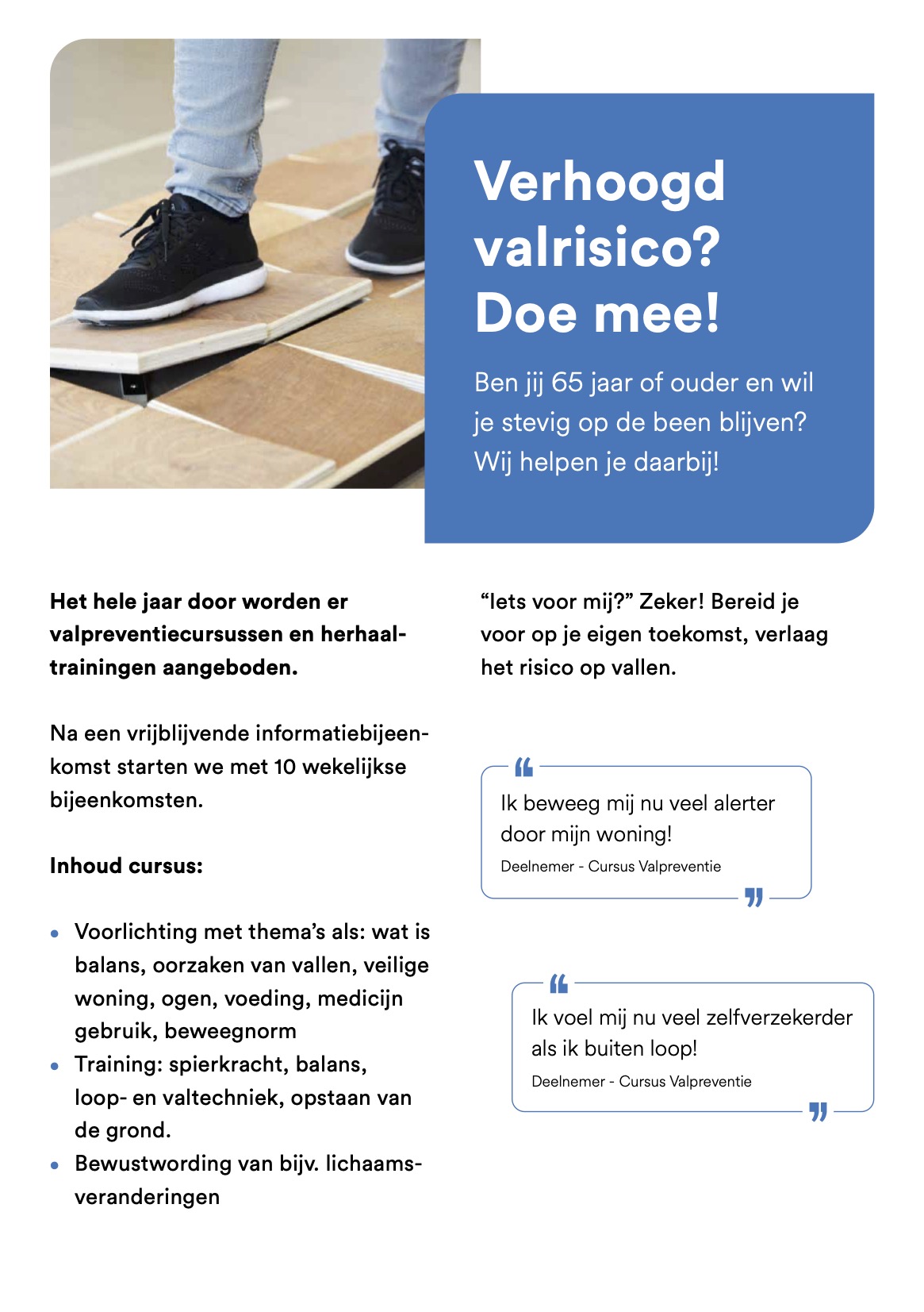 En misschien is er nu nog geen sprake van valincidenten. Echter hebben we het over preventie. Doe de cursus voordat je gaat vallen. Een 10-weekse investering helemaal voor jezelf!