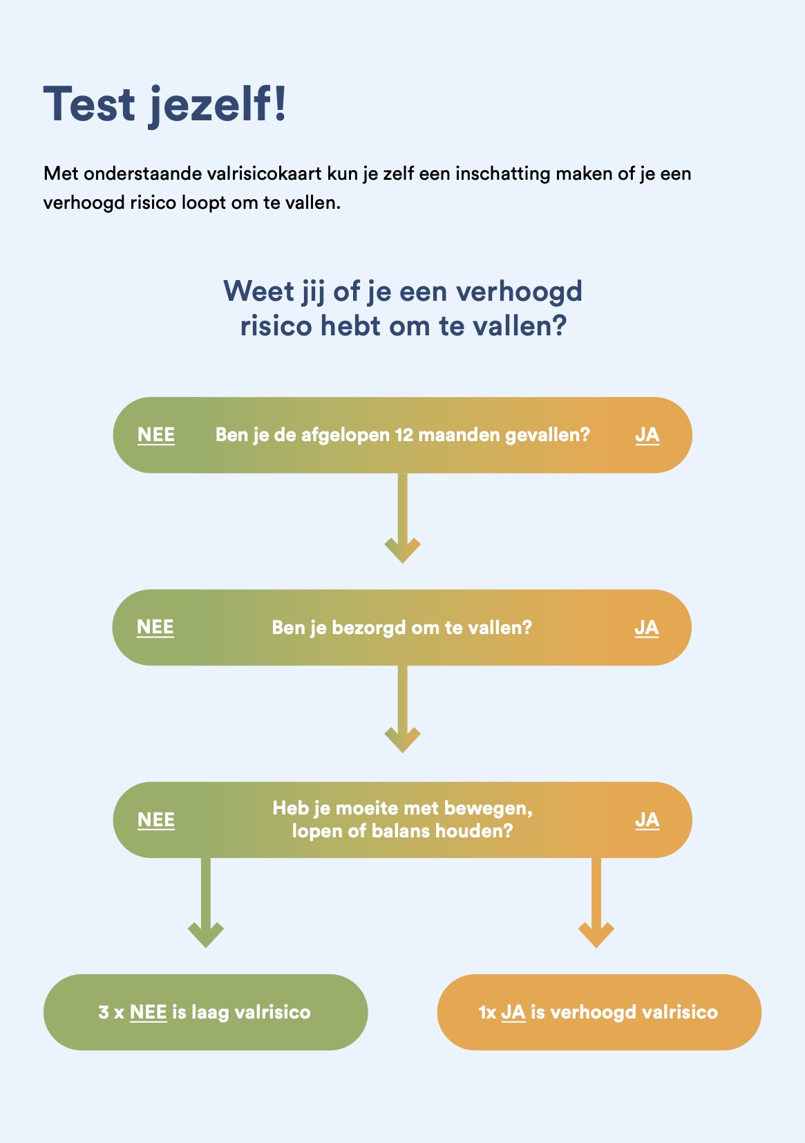 - Je kunt langer veilig en zelfstandig thuis blijven wonen omdat je weet hoe je je valrisico kunt verkleinen.